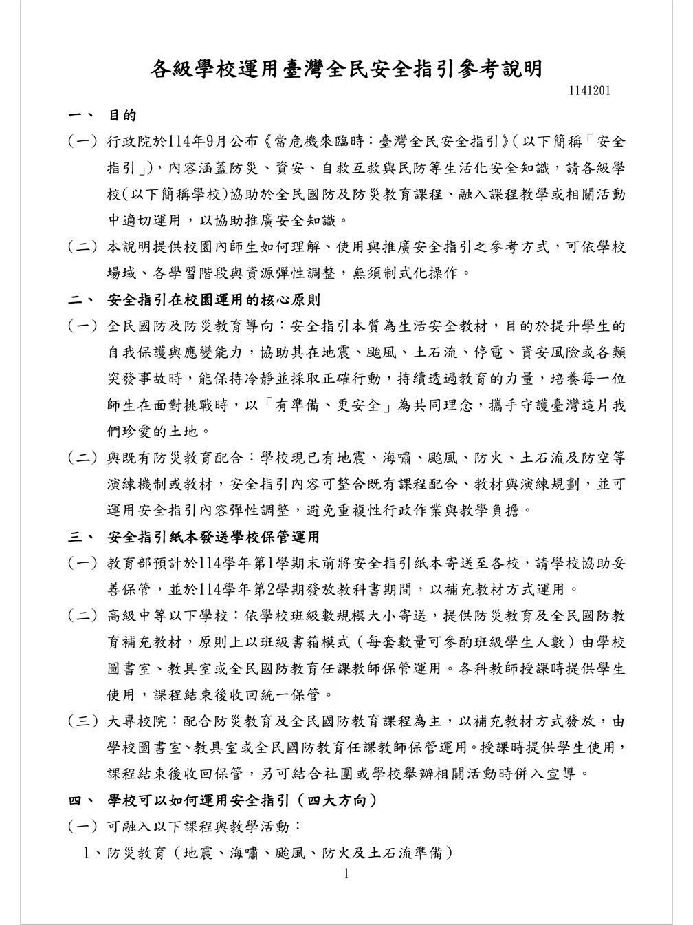✨行政院已於114年9月公布《當危機來臨時:臺灣全民安全指引》,教育部為使各級學校擴大宣導運用,提供師生與家長在面對各類危機時的正確行動方式與防護要領,已於官網設立「全民安全指引專區」,並頒布「各級學校運用臺灣全民安全指引參考說明」資料,說明如次: